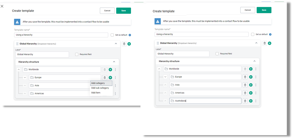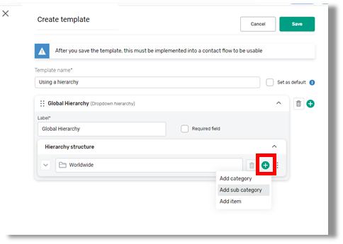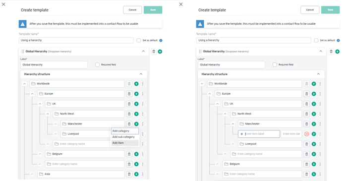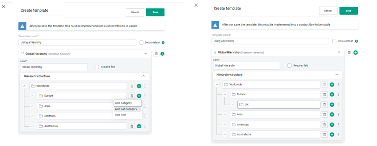 We can then create whatever sub categories we need for the organisation, and at each level we have the opportunity to create more categories at the same level, sub categories underneath, or Items as actual dropdown options for agents to select and have data values that can be recorded.