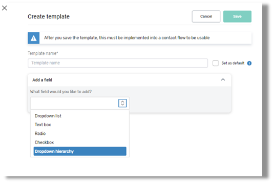 A “Dropdown Hierarchy” will allow agents to select a data label from a Hierarchy of options that can be configured, particularly suited to larger and complex organisations. We will cover this in detail in a later section.