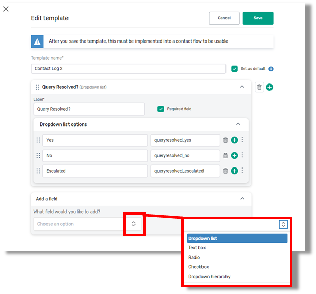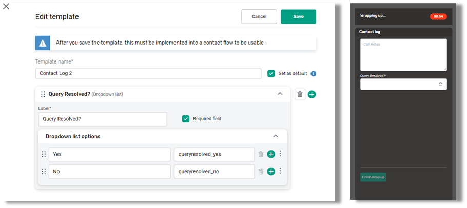 Let’s say a company initially just wanted a simple Query resolved Yes / No option to appear. An example of that is below, and how that might look to an Agent. However, if the company setup an escalation process to a specialist team, they might want to be able to track this, so would want to maybe amend the contact log screen.