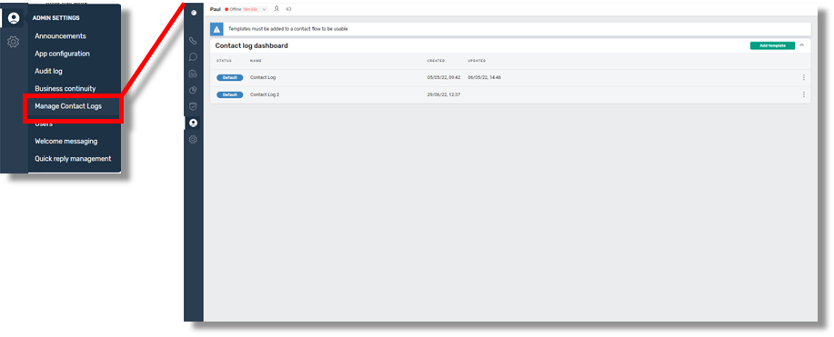 From this screen you can edit or delete any contact log configuration by selecting the three dots next to the specified configuration and also create a new template by selecting the Add template button.