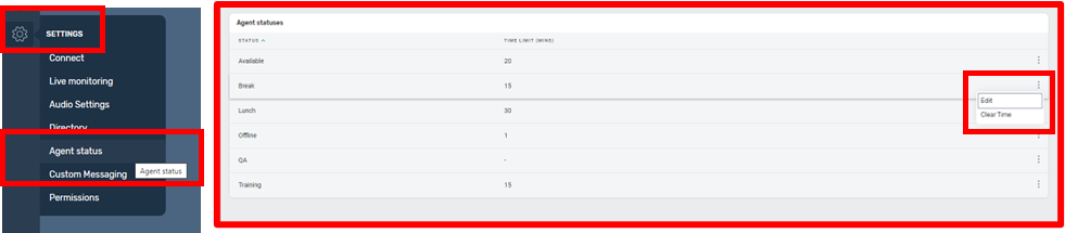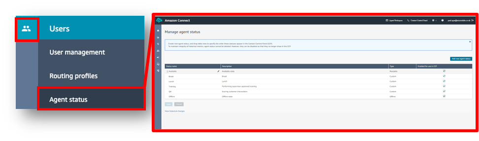 To view, edit and delete agent status values, select Users from the side menu then Agent status.