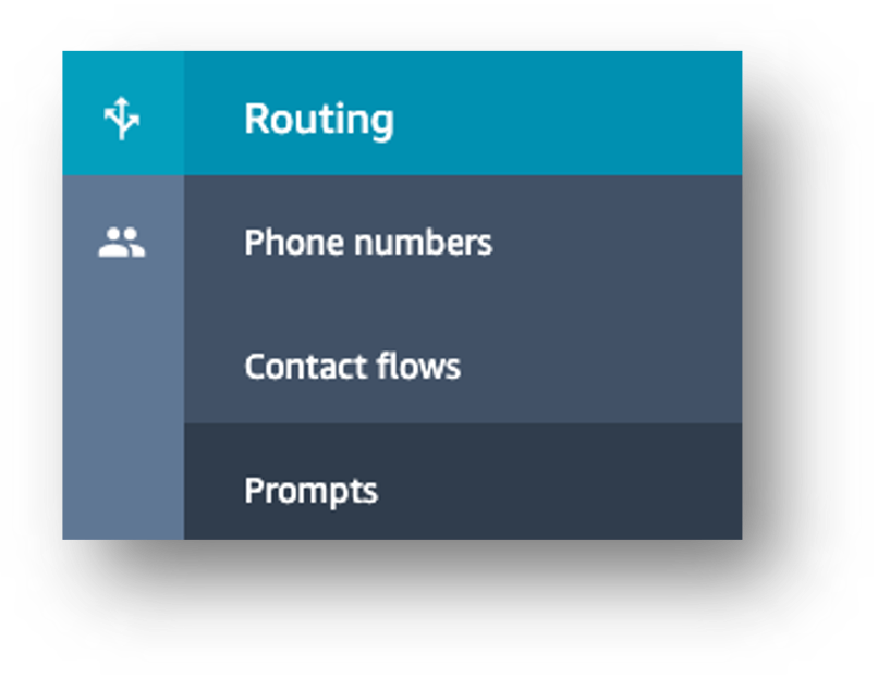 - To view prompts in Amazon Connect, select Routing from the side menu then Prompts