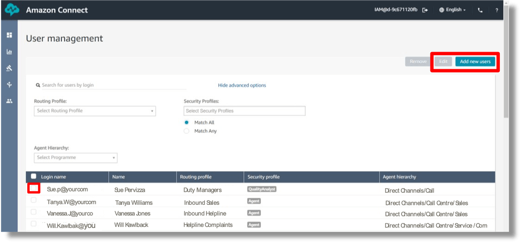 Creating a new user, amending existing user details or suspending a user is all done through the User Management section within Amazon Connect. This can be launched from the dashboard by clicking on “View Users” link within the Configure Users section or by selecting User Management from the User menu on the left.