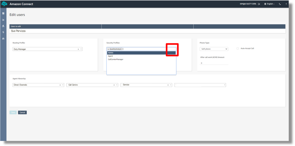 Once you have loaded up the users details you can then amend any of the fields by clicking into it if it is a text field, such as amending name details; other fields will be amended by clicking on drop down buttons to select from pre-configured options, such as giving them an additional security profile or taking a security profile away which would suspend their access to receive or make calls.