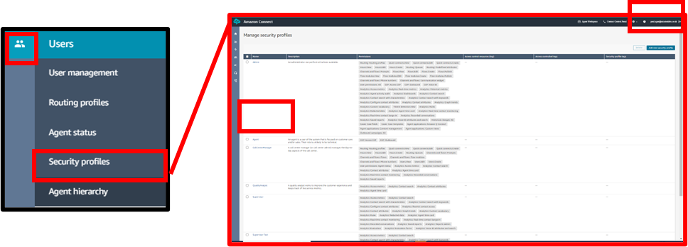 These roles can be created and amended in the Security Profile Section of Amazon connect or in the Permissions area of SmartAgent for features that are configured by the SmartAgent Application.