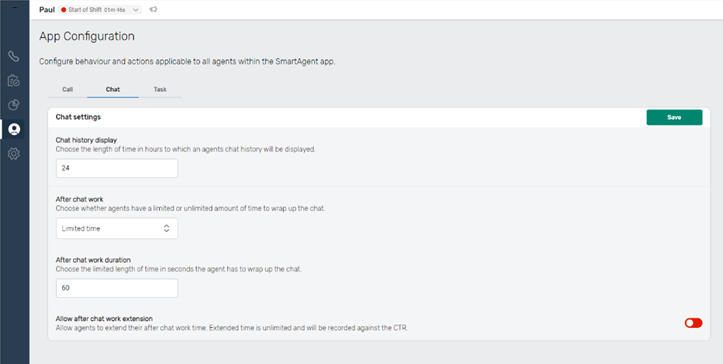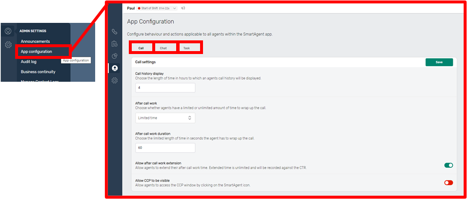 Within the App Configuration screen you can change configuration options such as how After Contact Work (ACW) is handled across different channels without having to make changes within the Amazon Connect system. Any changes on this screen will apply to all agents within the SmartAgent App.