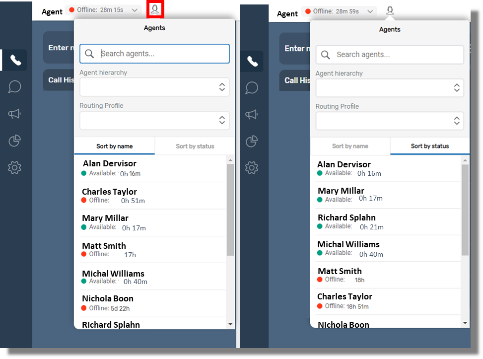 They can also search the list of agents sorted by alphabetical name order, or by clicking on the alternate tab to search by status.