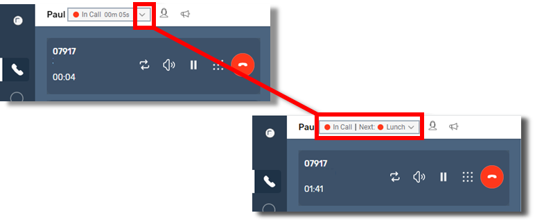 If you are approaching a scheduled break or end of your shift and are still on a call you can go to the status dropdown box and select the appropriate “Next” status from those that appear in the dropdown box.