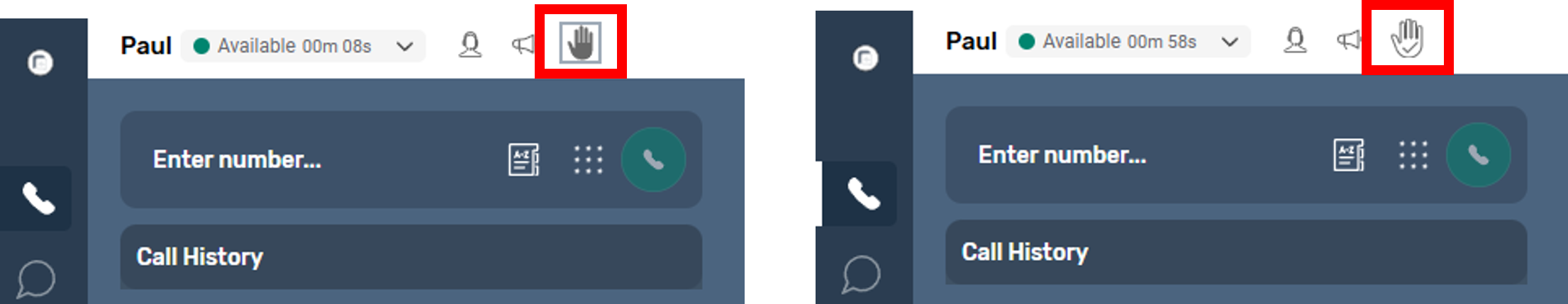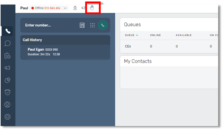 Agents can click on the Hand logo – this will then change colour to Solid grey and show as a highlight on the Real Time Data screen that supervisors have access to.
