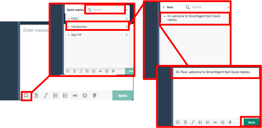 When responding to any type of chat, at the bottom of the text input field, you have the “Quick replies” icon. If you select this you can either manually search using keywords or use the folder / organization structure setup by your organization.
