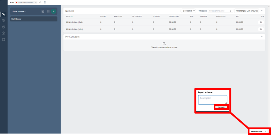 Agents can use the “Report an Issue” function if they are experiencing difficulties on a call with regards to clarity / call quality and want to investigate any further issues.