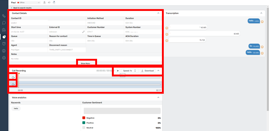 The Contact Details field contains all the key metric information of the contact and additional meta-data, such as user defined fields, the options chosen by the customer and any after contact work notes input by the Agent. The full data can be accessed by selecting the “show more” option.