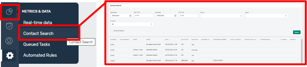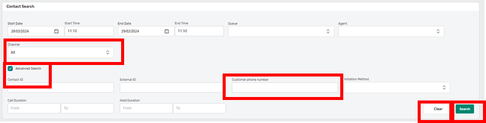 The screen will automatically load all contacts within the last 24 hours across all channels, but you can do a refined search using the various data fields in standard search or advanced search options. If you want to create a new search you can select the “clear” button, this will reset the search to the last 24 hours (the same as when you first initialised the page).