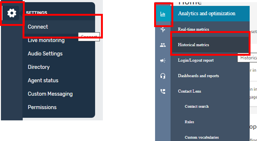 Connect can be accessed from the Settings menu – this will then open an additional tab in Amazon Connect. Historic and Realtime metrics, as well as other reporting features can be accessed from the “Chart” menu option.