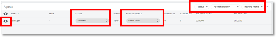 This is also the screen where you can live monitor contacts made by your team by clicking on the Eye icon which will appear when an Agent is on a live contact.