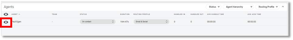 As a supervisor from the Real-time data screen you can also live monitor a voice call. Any agents that are “on contact” will have the “Eye” symbol next to their details.