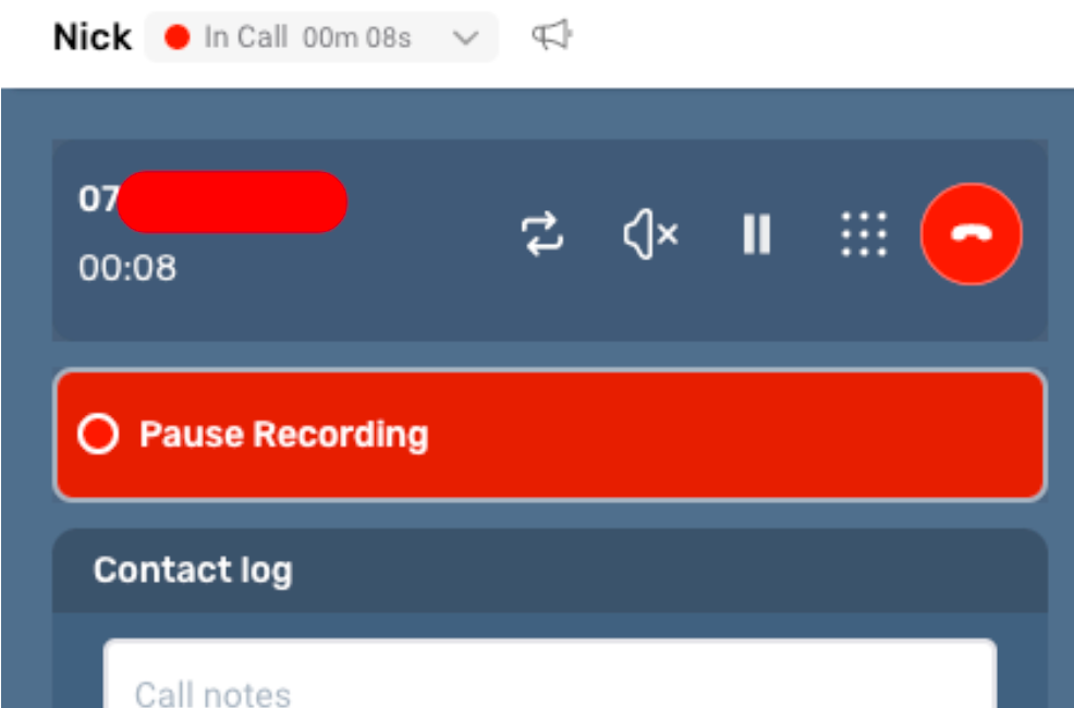sa-recording-button | Voice Webchat | This attribute can be set to display a ‘Pause recording’ button to the agent. Clicking this button would temporarily pause the call recording until the button is clicked again. This can be useful whilst collecting sensitive information such as payment details from a customer. Alternatively, Amazon Contact Lens could be used to redact sensitive information from call recordings automatically. ![]() The ‘Pause Recording’ button allows the agent to pause the call recording ![]() Once paused, the ‘Start Recording’ button allows the agent to resume the call recording. Note: The sa-call-recording-behaviour attribute must also be set for the call recording component to display. Note: This attribute will only work on SmartAgent instances configured to allow it. Please speak to Mission Labs if the attribute isn’t working for you. Values: SHOW - Show the start/pause/resume recording button HIDE - Hide the start/pause/resume recording button |