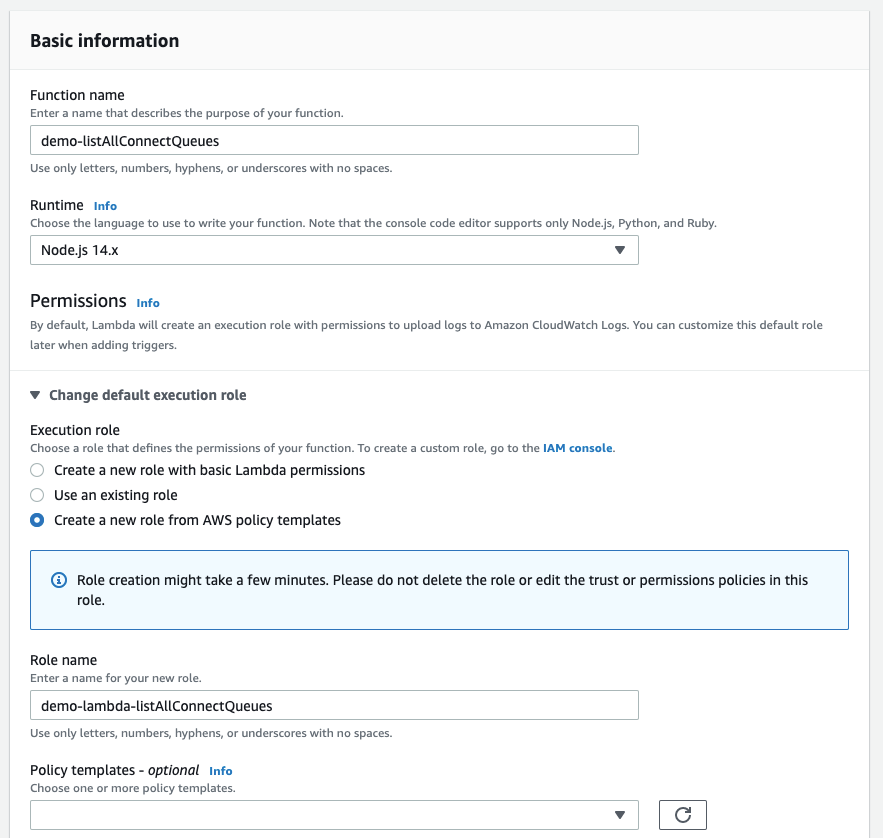 Find the role we created in the IAM section of the AWS Console (named ‘demo-lambda-listAllConnectQueues’ in the example above)