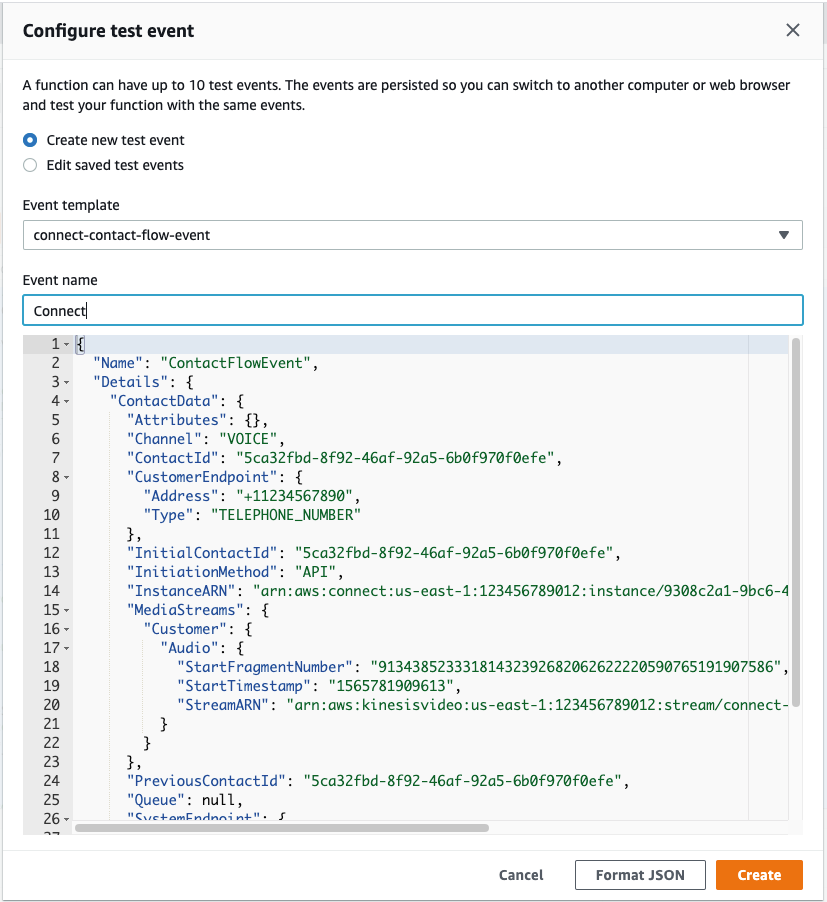 Select ‘Connect Contact Flow’ from the sample events provided by AWS and give the test event a name, for example ‘Connect'.