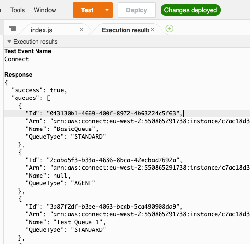 Check the result in the ‘Execution result’ tab and you should see a list of the queues from the Connect instance.