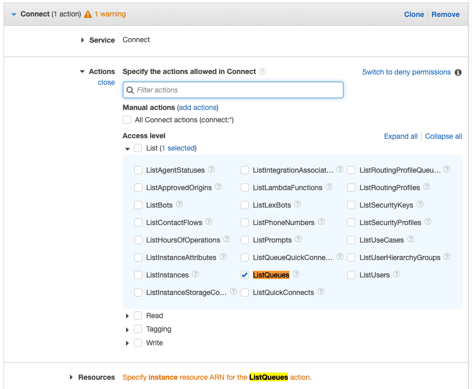 for one Connect instance.Set the correct Connect instance ARN in the ‘Resources’ section.