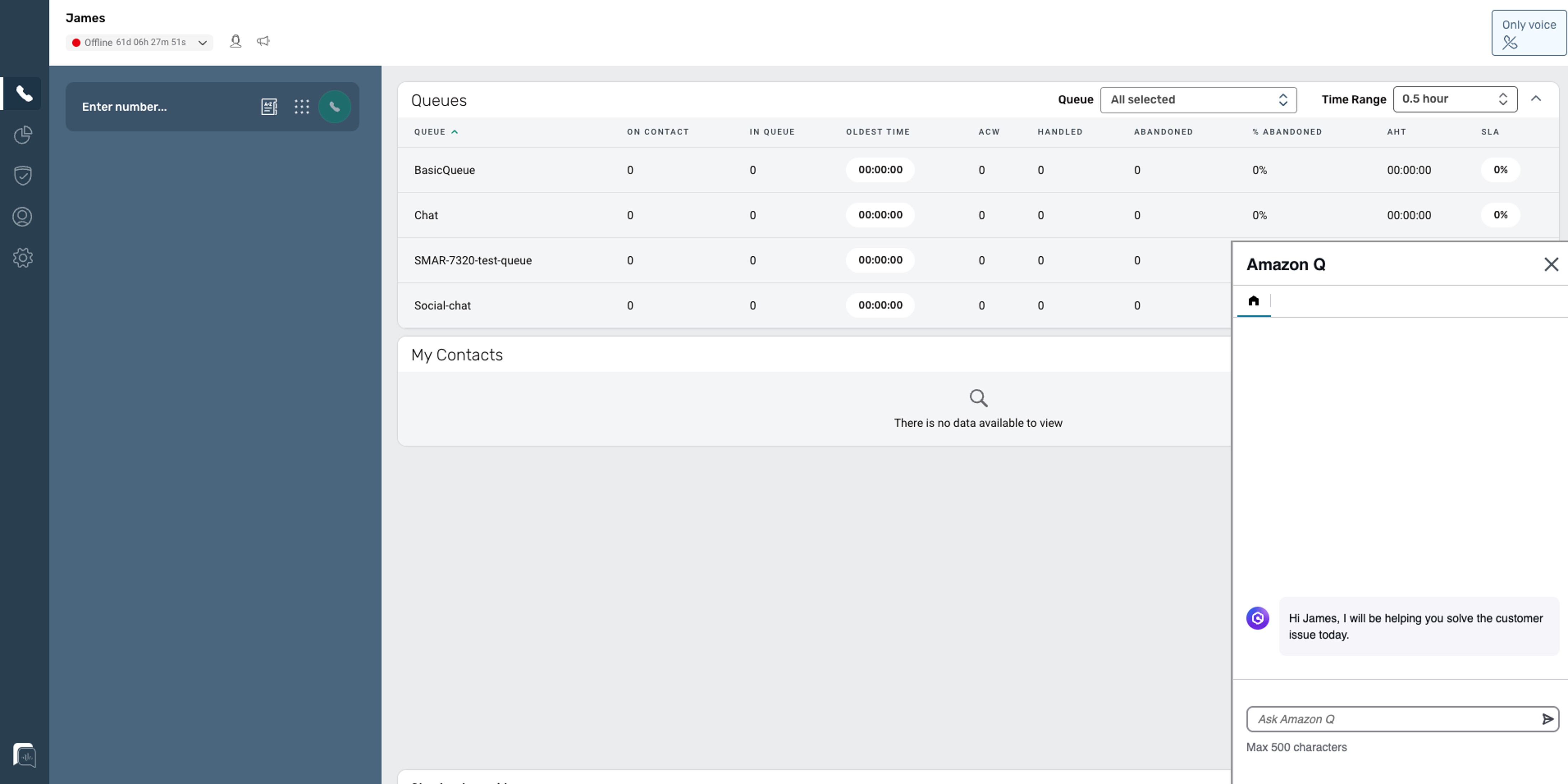 While the Agent is logged into Smartagent or Amazon Workspace they can have Amazon Q running at the same time to monitor the ongoing conversation. It can respond in real-time with suggested items or articles from it’s reference knowledgebase.