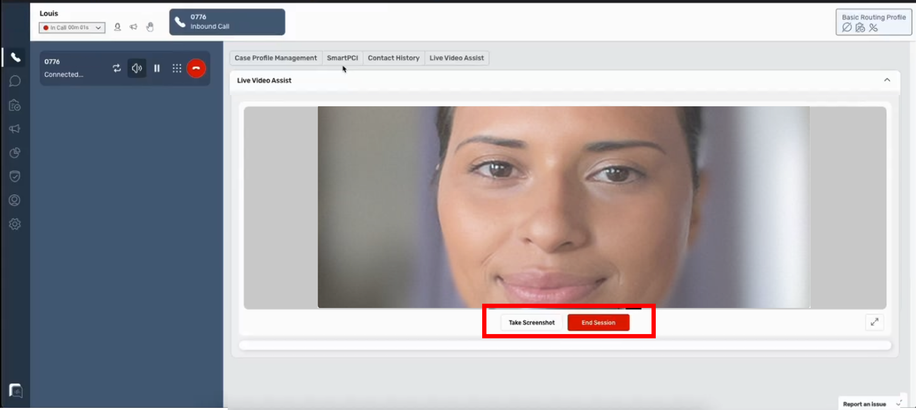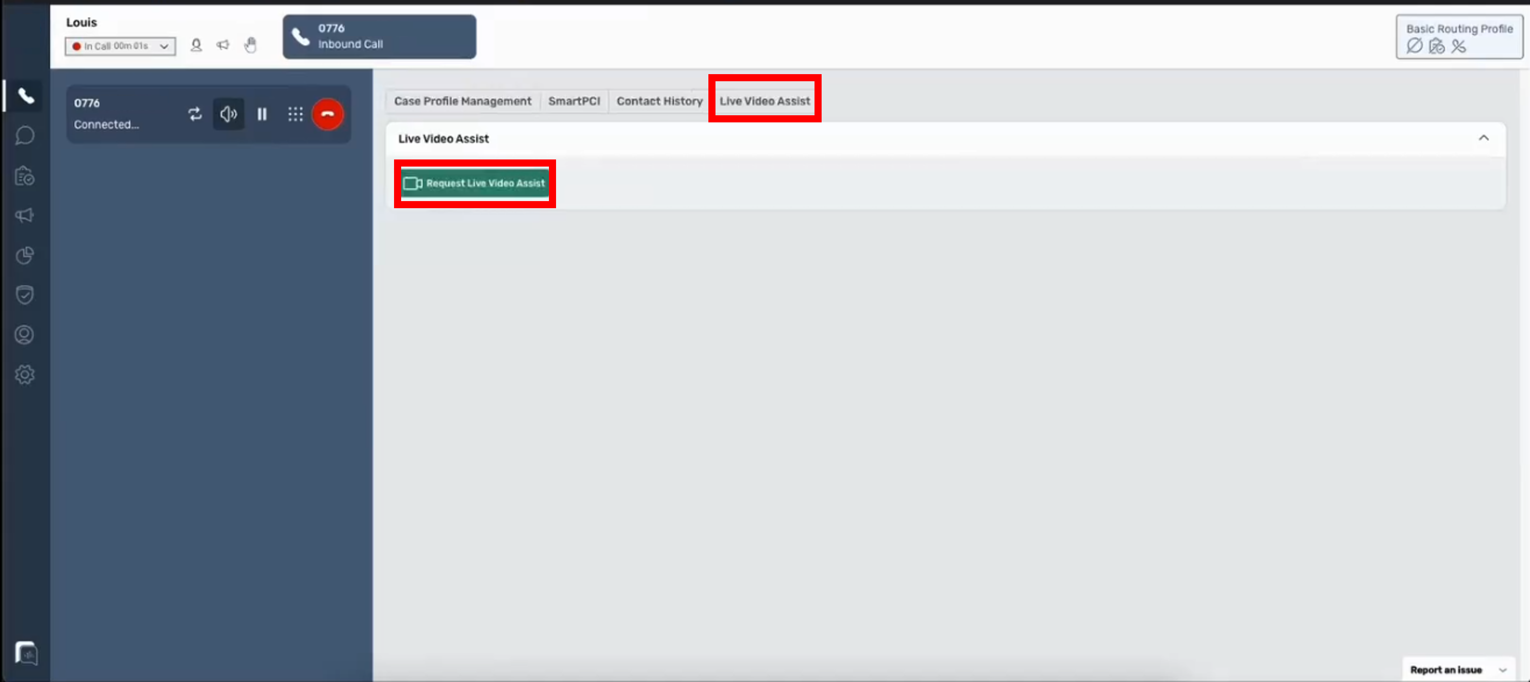 An Agent can only setup a Live Video Assist session when they are on an active call, this can be inbound or outbound call. If a live video assist session is needed they would go to the Live video Assist tab and select the “Request Live Video Assist” button.