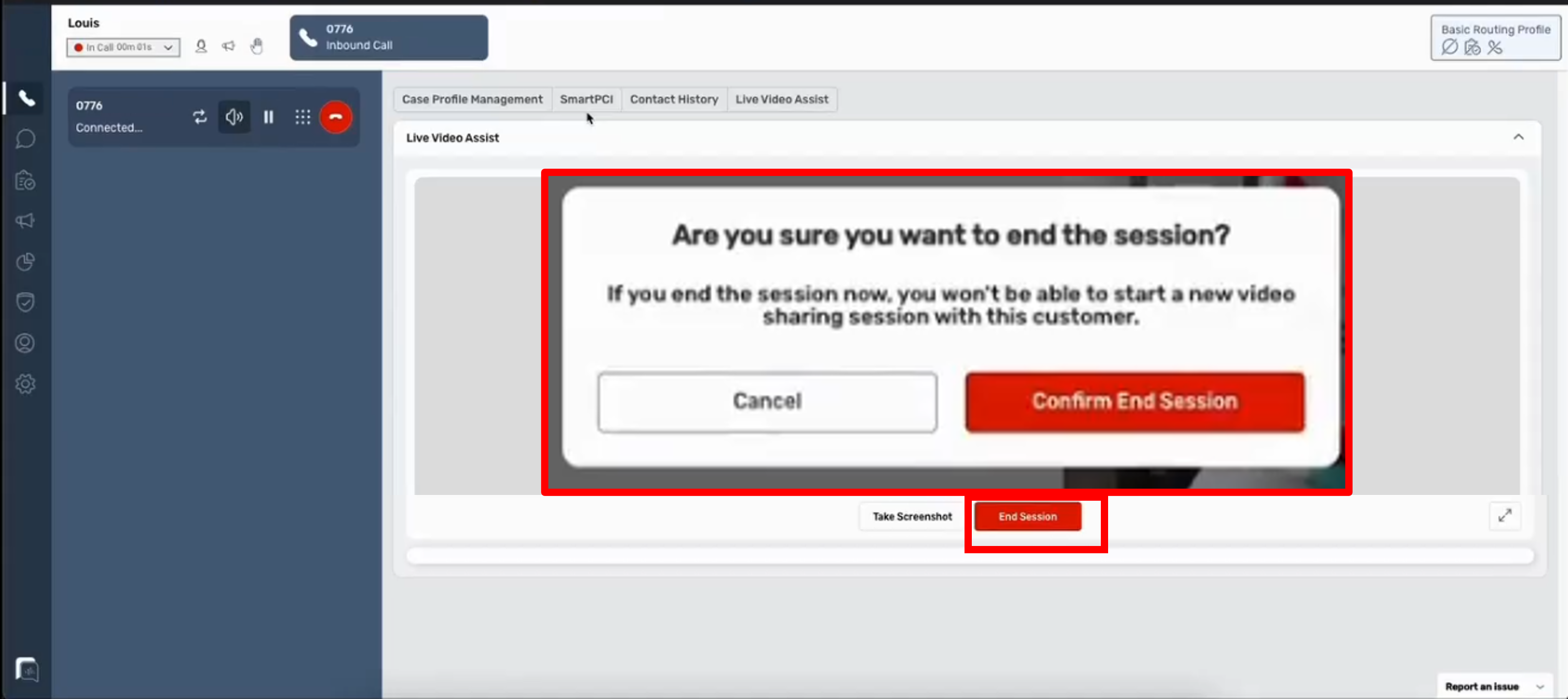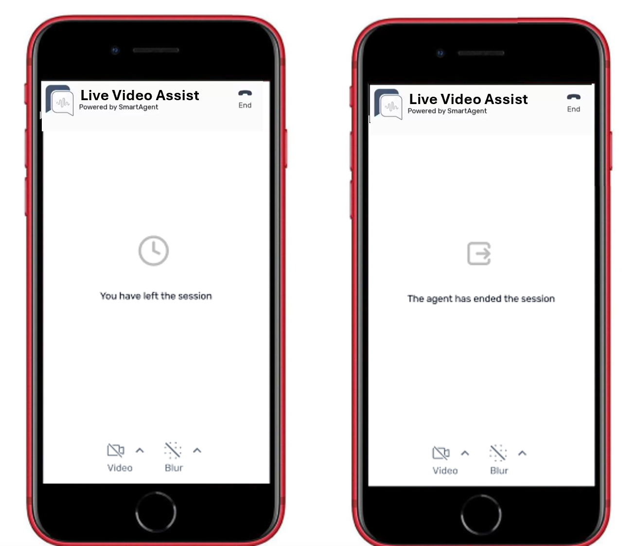 The Agent can end the video session by selecting the “end session” button. The customer can end the session by selecting the red “end” telephone icon at the top of their Mobile screen.