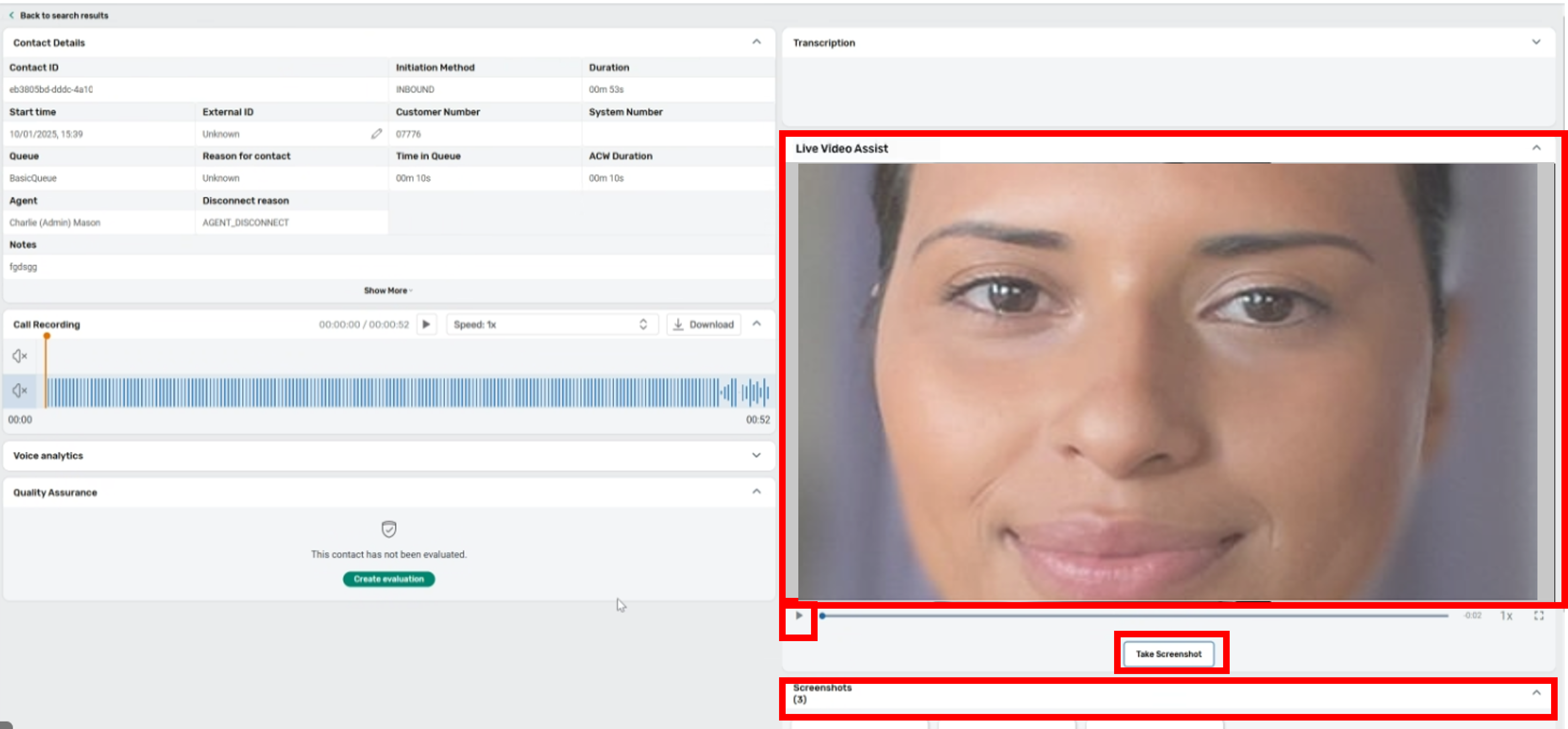 Selecting the CTR record of the contact will bring up the normal CTR screen with two additional features. As well as the normal Audio recording of the call, there will be a recording of the Live Video Assist session.