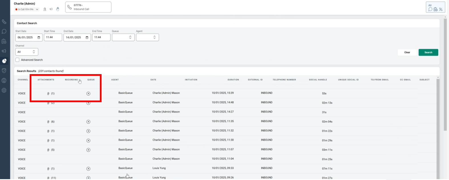 On the CTR search screen Live Video Assist sessions will show as voice calls with attachments and a recording icon. The attachments are the individual screenshots selected by the agent and the recording is the recording of the Live Video Assist session.