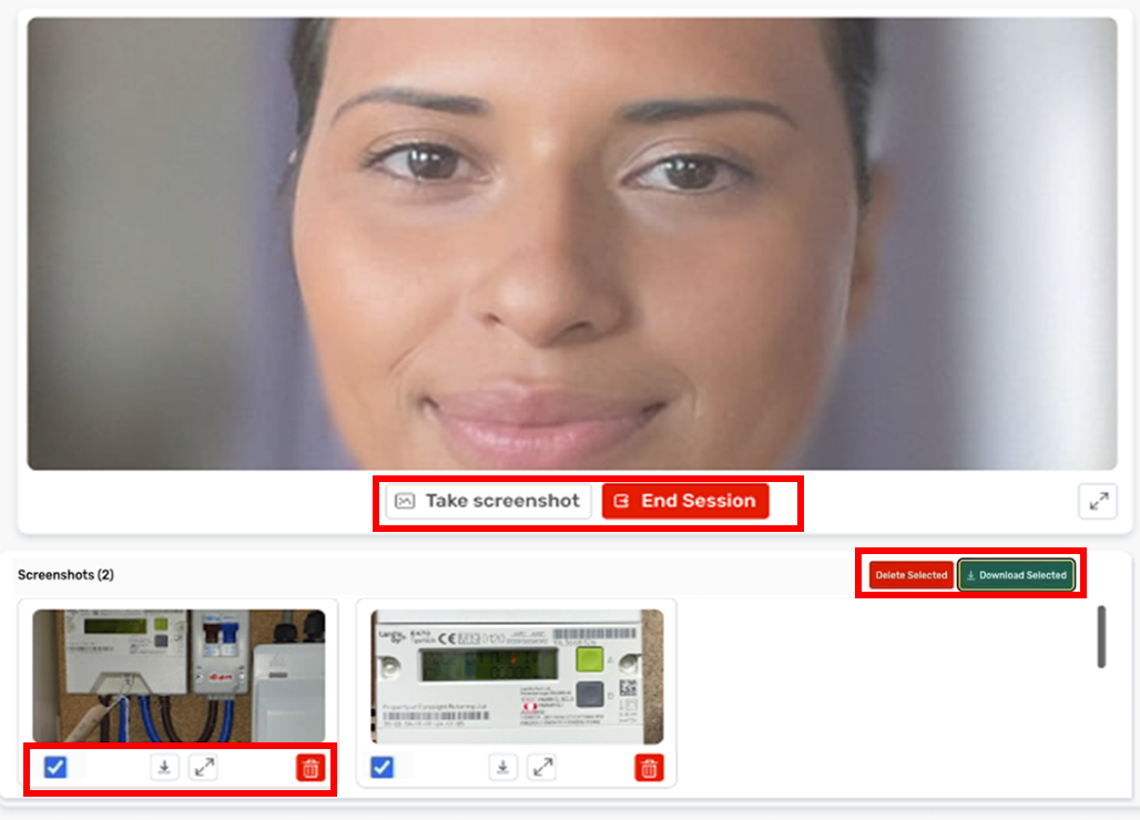 Once the customer has joined the session, the Agent’s screen will show the video feed from the customers camera. The Agent can then take screenshots as required from the video feed by selecting the “Take Screenshot” button.