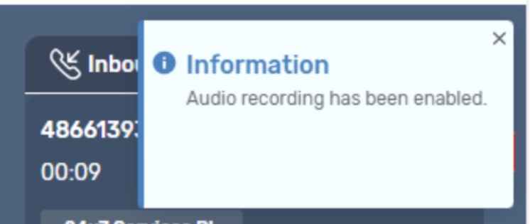Call Recordings Notification | If Call Recording is enabled, a new notification message will appear. When agents accept calls this message will be displayed on the right-hand side of the screen. ![]() ![]() |