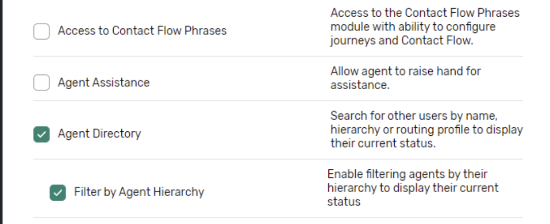 Agent Directory - Hierarchy Restriction | Access to ‘Agent hierarchy’ filter on Agent Directory is restricted by a sub-permission to allow managers decide if agents should only be able to see a list of agents in the same agent hierarchy or below. ![]() | |||