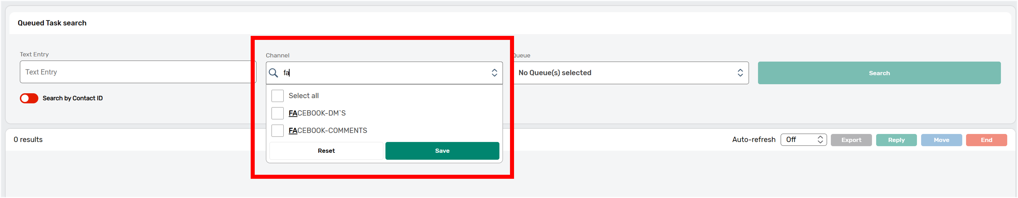 Users can now search for options in both the Channel and Queues drop-down menus by typing text.