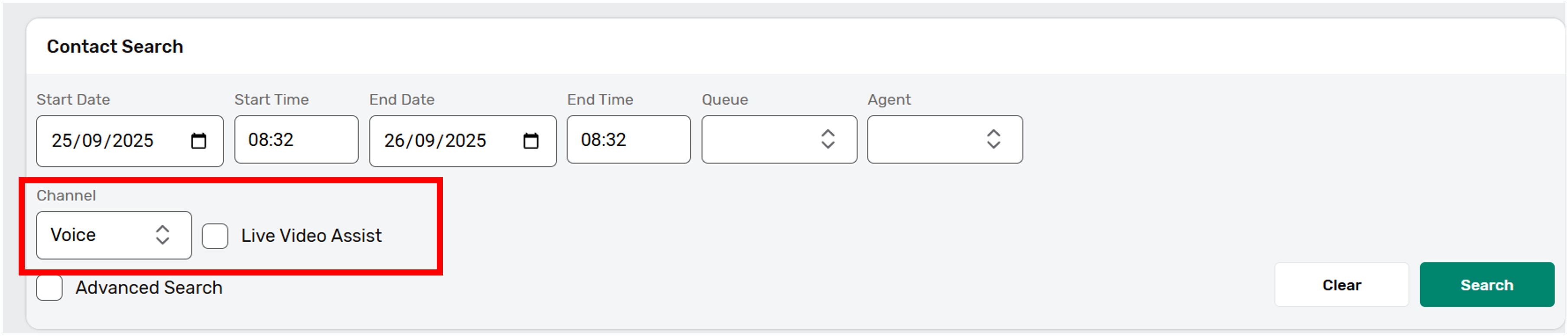 This option is permission-based. If your organisation has Live Video Assist enabled and your role includes the ‘View Recordings and Images’ permission, you’ll see a Live Video Assist checkbox in Contact Search when the channel is set to Voice.