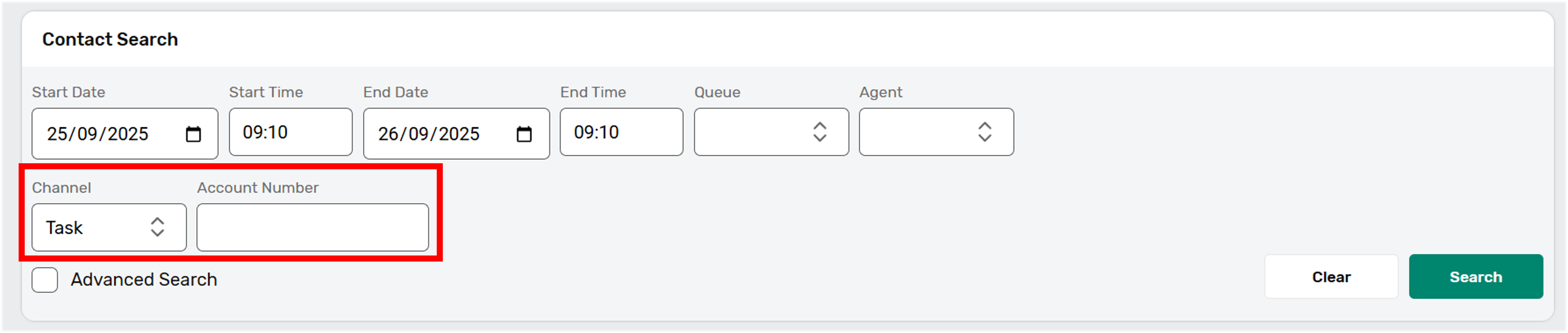 This option is permission-based. If your organisation has the Task Import feature enabled and your role includes the new ‘Contact Search – Search by Account Number’ permission, you’ll see a new Account Number field in Contact Search when the channel is set to Task.