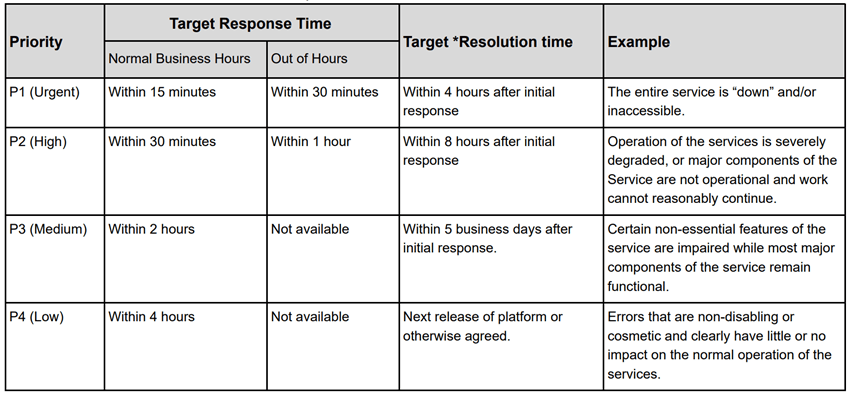 Please see below for standard incident definitions, response times and resolution time SLAs.